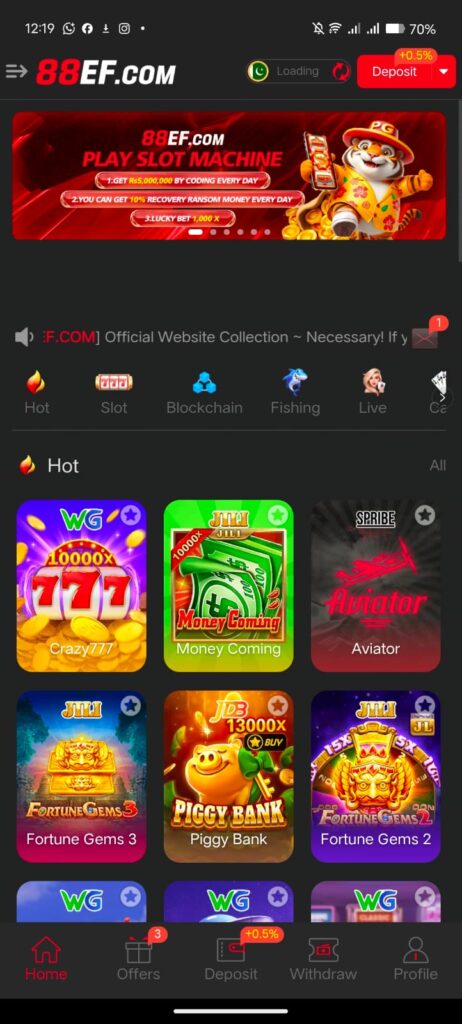 This game is a more easy or enjoyable fun game for players. 88EF Game app APK download Free For Android phone and iOS devices. In this 88EF Game users can get small income through this game easily withdrawing through our account. Users will deposit in game apps betting different games earn real money. in game APK variety of features of the game.