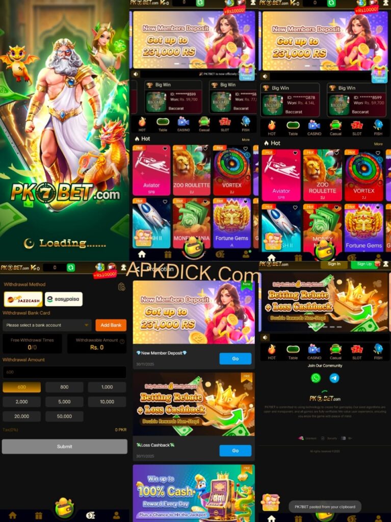 PK7Bet game is a real earning online platform where you can play different games and earn real money rewards. You can bet money on different games to earn real money. Quick withdrawal and local payment through jazz cash and easypasia. Claim your VIP bounces. Invite friends and collect referral rewards. It is free to download and easy to use.